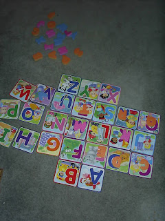 I put together another quick ABC matching game one afternoon. We took the foam letters out of our ABC puzzle and matched them up with some ABC flashcards (I'm not a big fan of flashcards, but these were a gift and M loves them).